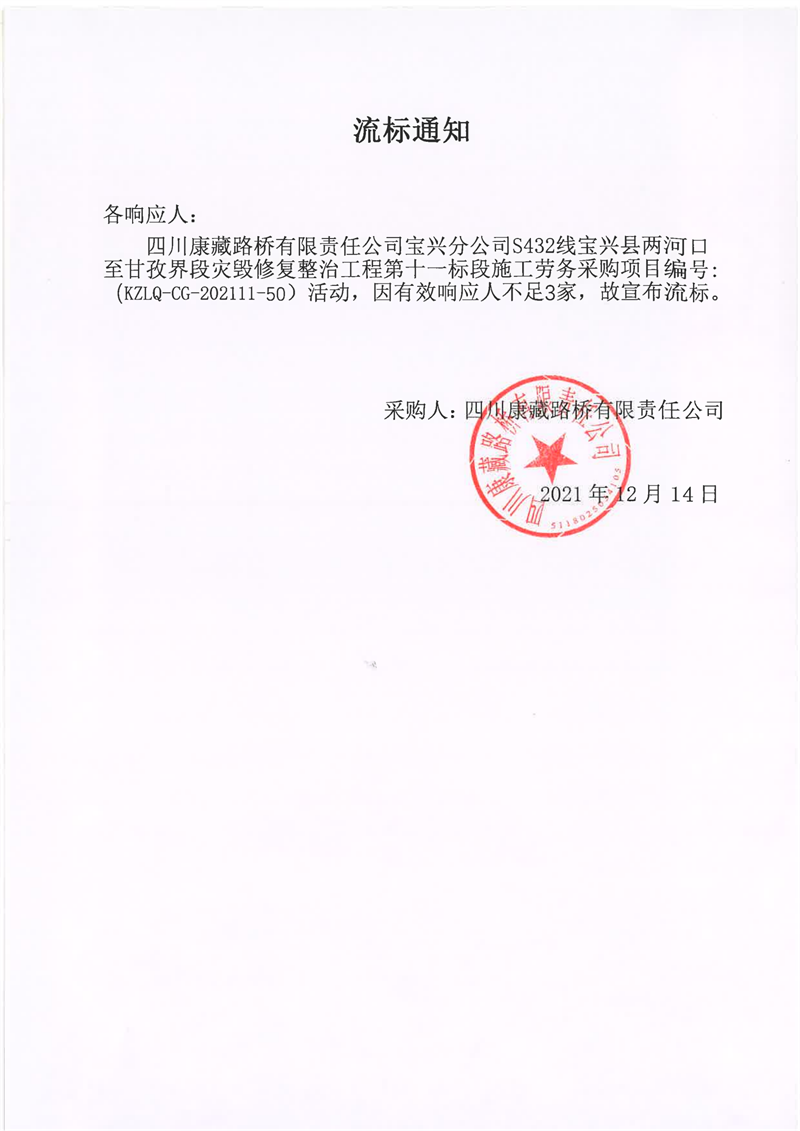 S432線寶興縣兩河口至甘孜界段災(zāi)毀修復整治工程第十一標段施工勞務(wù)(第二次)流標通知