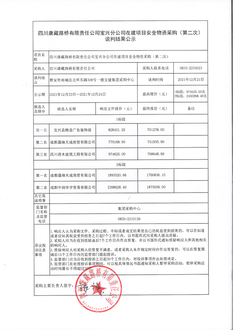 四川康藏路橋有限責(zé)任公司寶興分公司在建項(xiàng)目安全物資采購(gòu)(第二次)談判結(jié)果公示