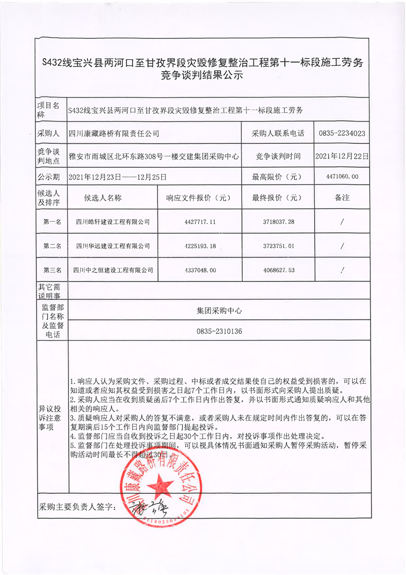 四川康藏路橋有限責任公司S432線寶興縣兩河口至甘孜界段災毀修復整治工程第十一標段施工勞務(wù)競爭談判結(jié)果公示