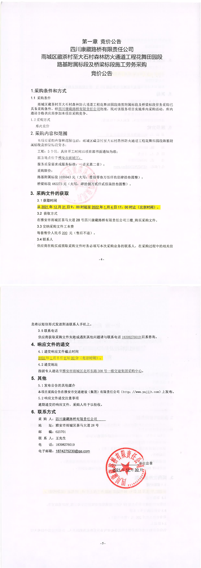 四川康藏路橋有限責任公司雨城區(qū)藏茶村至大石村森林防火通道工程花舞田園段路基附屬標段及橋梁標段施工勞務(wù)采購競價公告