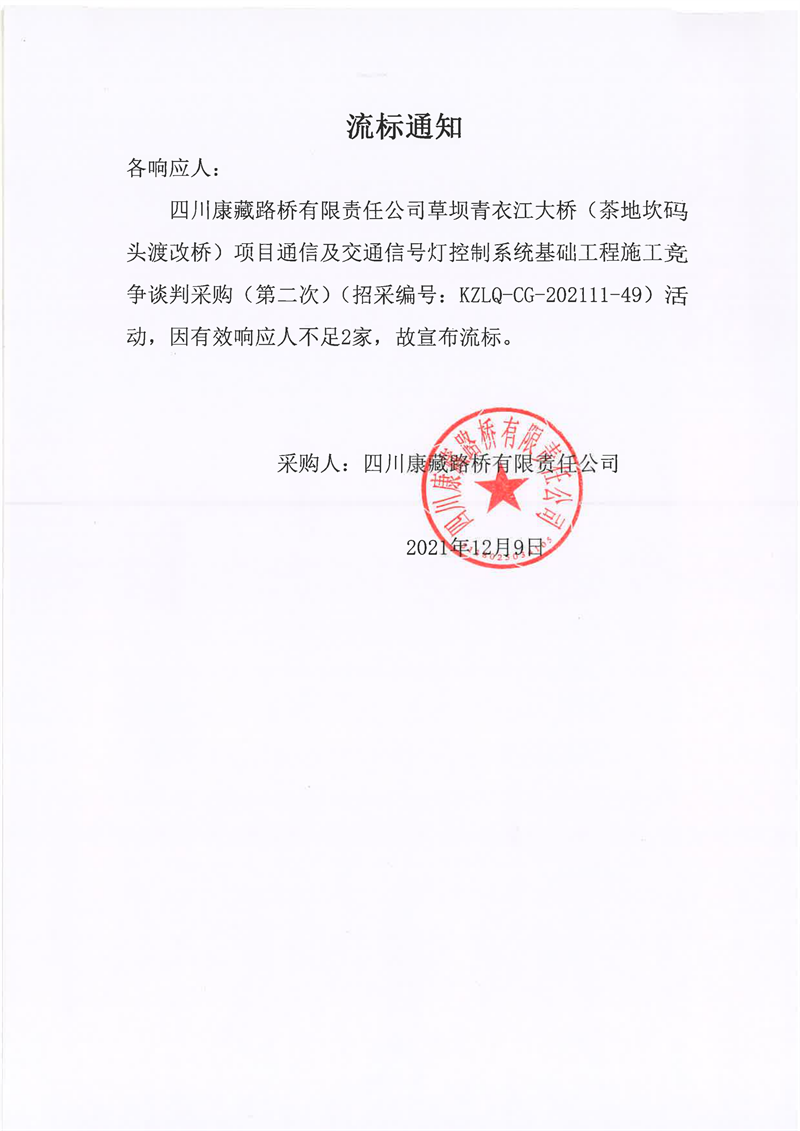 四川康藏路橋有限責(zé)任公司草壩青衣江大橋(茶地坎碼頭渡改橋)項(xiàng)目通信及交通信號燈控制系統(tǒng)基礎(chǔ)工程施工競爭談判采購(第二次)流標(biāo)通知