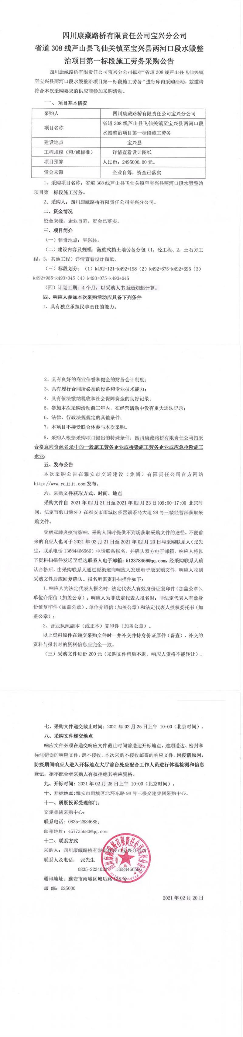 四川康藏路橋有限責(zé)任公司寶興分公司省道308線蘆山縣飛仙關(guān)鎮(zhèn)至寶興縣兩河口段水毀整治項目第一標(biāo)段施工勞務(wù)采購公告