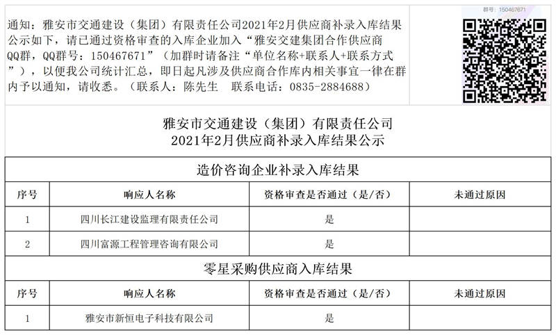 雅安市交通建設(shè)(集團)有限責任公司2021年2月供應商補錄入庫結(jié)果公示