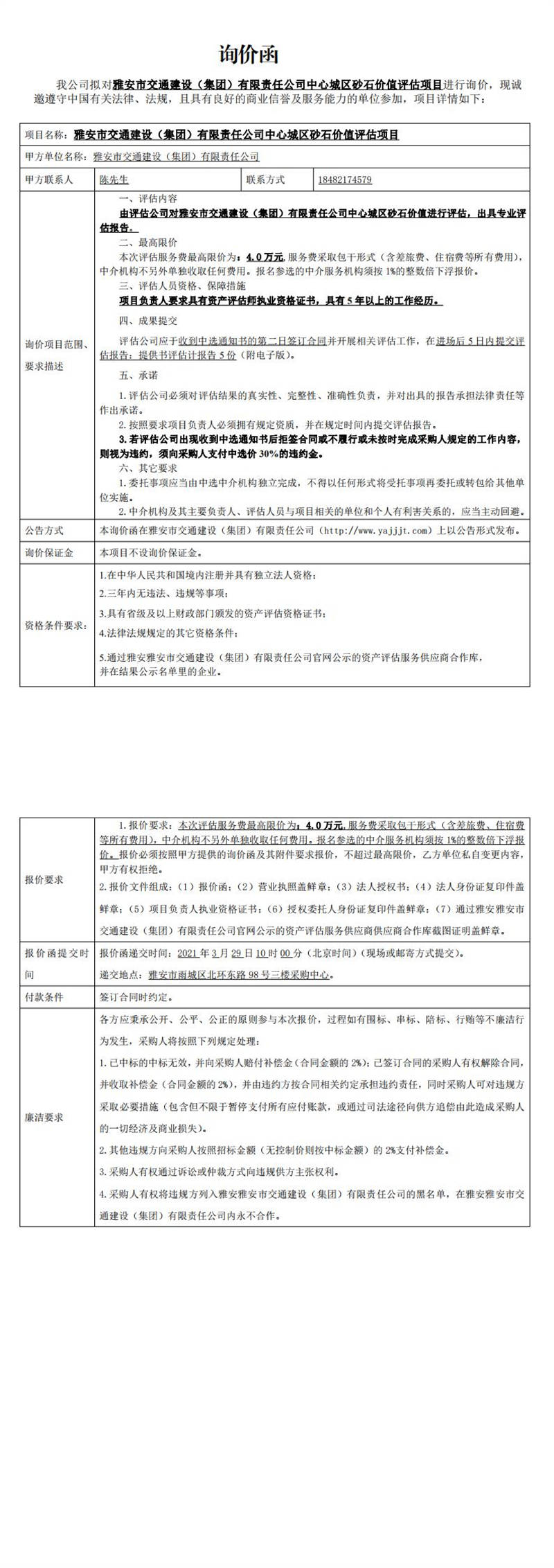 雅安市交通建設(shè)(集團(tuán))有限責(zé)任公司中心城區(qū)砂石價值評估項目詢價函