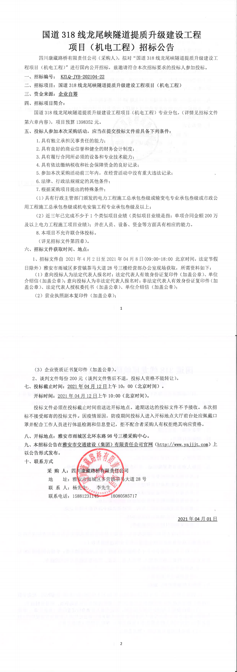 四川康藏路橋有限責(zé)任公司國道318線龍尾峽隧道提質(zhì)升級建設(shè)工程項目(機(jī)電工程)招標(biāo)公告
