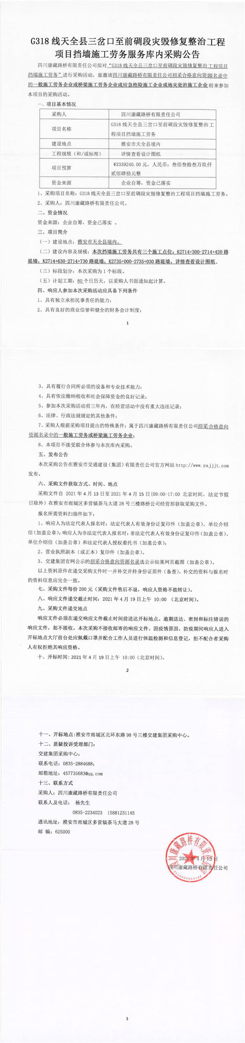 四川康藏路橋有限責任公司G318線天全縣三岔口至前碉段災毀修復整治工程項目擋墻施工勞務服務庫內(nèi)采購公告