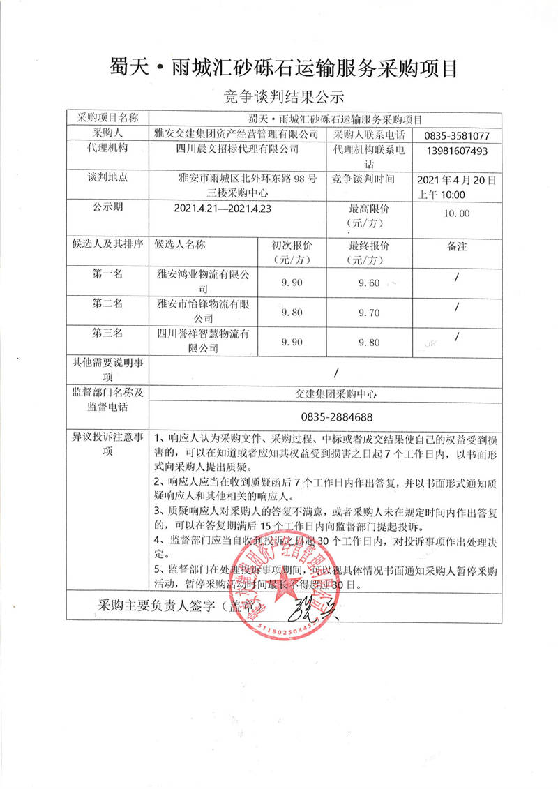 雅安交建集團資產(chǎn)經(jīng)營管理有限公司蜀天.雨城匯砂礫石運輸服務采購項目競爭談判結果公示