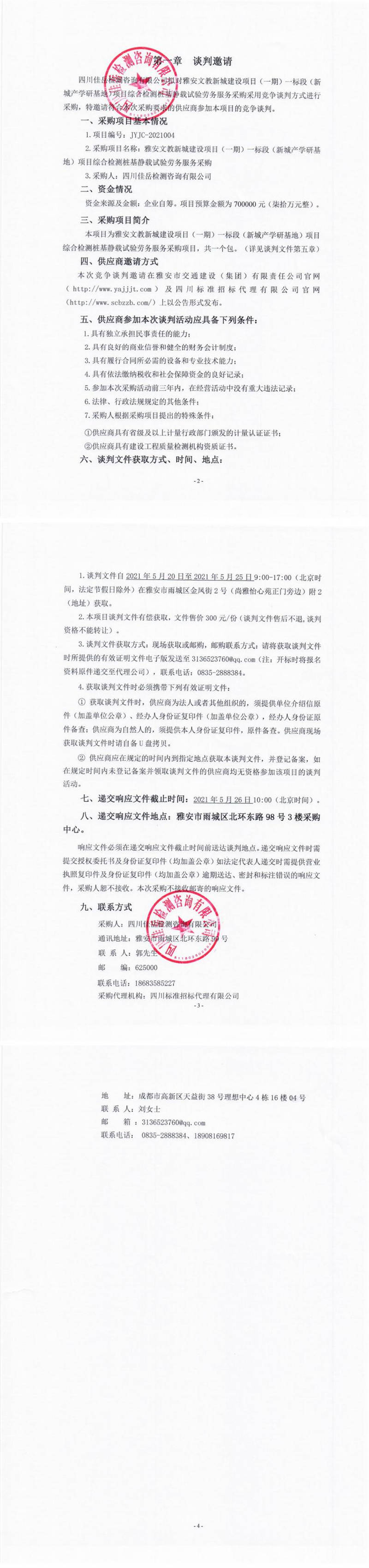 四川佳岳檢測咨詢有限公司雅安文教新城建設項目(一期)一標段(新城產學研基地)項目綜合檢測樁基靜載試驗勞務服務競爭談判公告