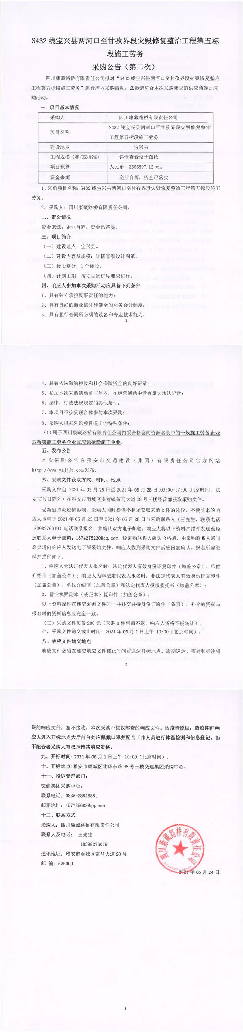 四川康藏路橋有限責任公司S432線寶興縣兩河口至甘孜界段災毀修復整治工程第五標段施工勞務采購公告(第二次)