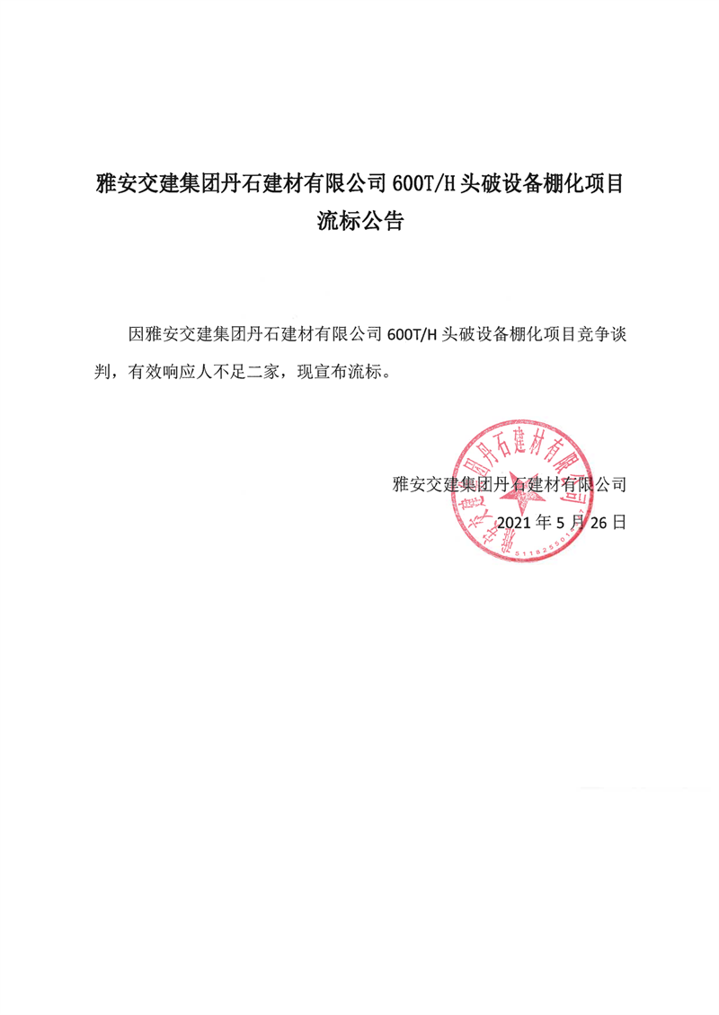 雅安交建集團(tuán)丹石建材有限公司600T/H頭破設(shè)備棚化項(xiàng)目流標(biāo)公告