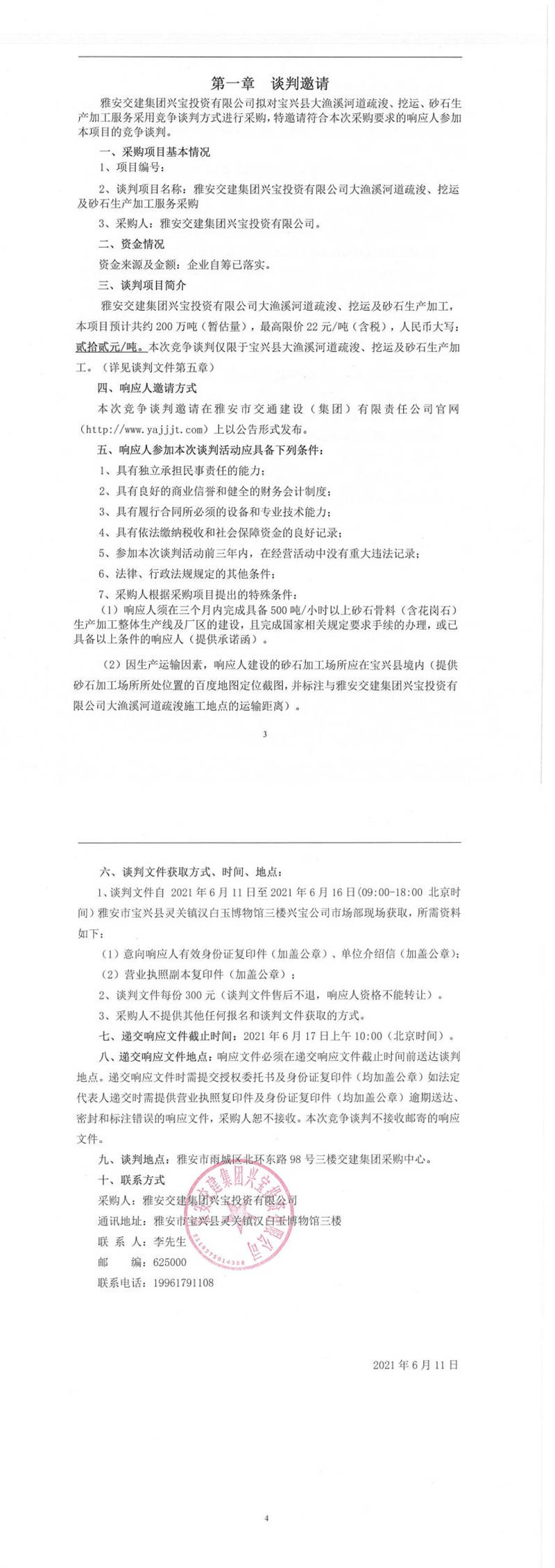 雅安交建集團(tuán)興寶投資有限公司大漁溪河道疏浚、挖運(yùn)及砂石生產(chǎn)加工服務(wù)采購競爭談判公告