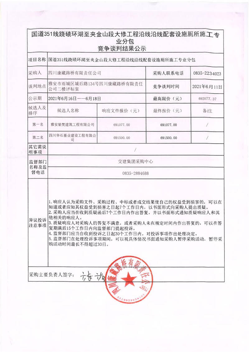 四川康藏路橋有限責(zé)任公司國(guó)道351線蹺磧環(huán)湖至夾金山段大修工程沿線沿線配套設(shè)施廁所施工專業(yè)分包競(jìng)爭(zhēng)談判結(jié)果公示