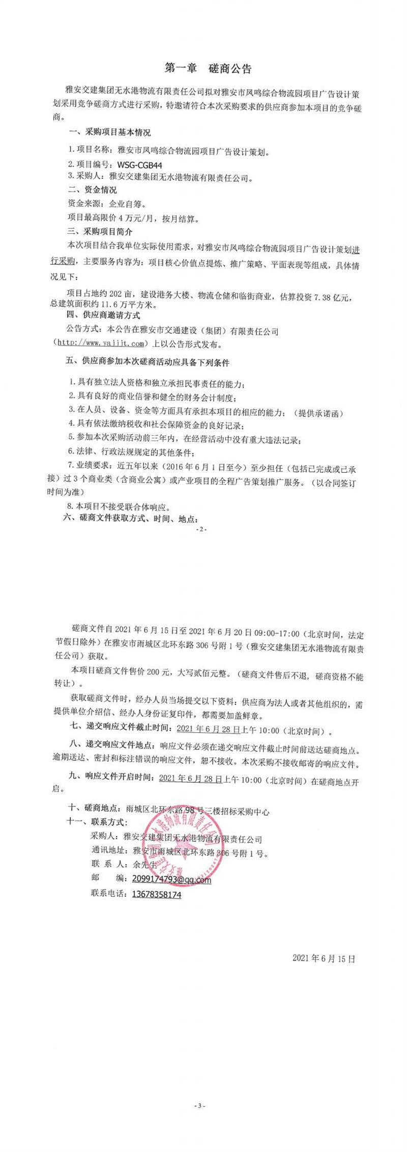 雅安交建集團(tuán)無水港物流有限責(zé)任公司雅安市鳳鳴綜合物流園項(xiàng)目廣告設(shè)計(jì)策劃磋商公告