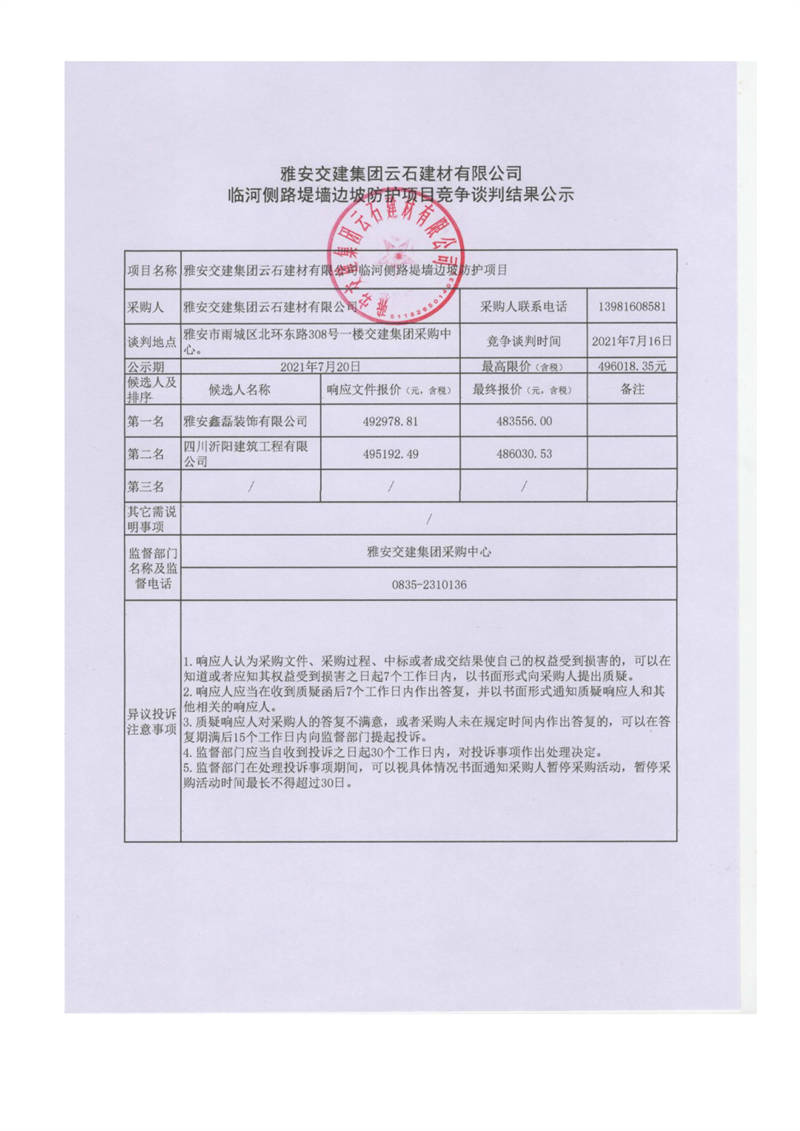 雅安交建集團(tuán)云石建材有限公司臨河側(cè)路堤墻邊坡防護(hù)項(xiàng)目競(jìng)爭(zhēng)談判結(jié)果公示