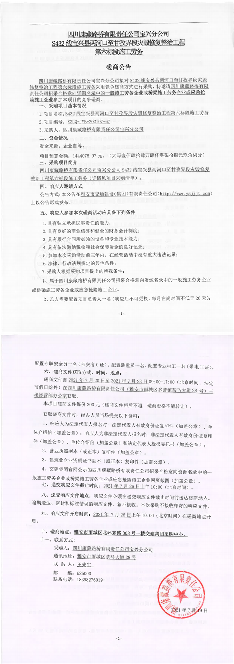 四川康藏路橋有限責任公司寶興分公司S432線寶興縣兩河口至甘孜界段災(zāi)毀修復(fù)整治工程第六標段施工勞務(wù)磋商公告