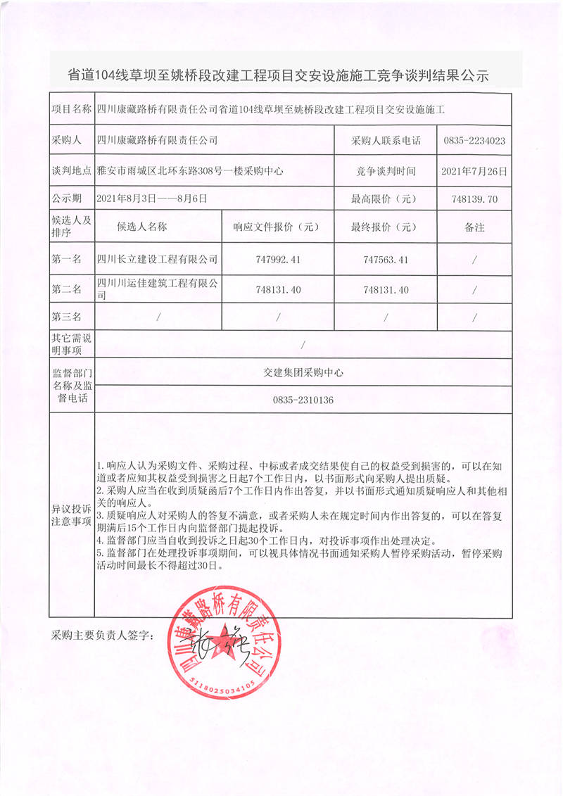 四川康藏路橋有限責(zé)任公司省道104線草壩至姚橋段改建工程項(xiàng)目交安設(shè)施施工競爭談判結(jié)果公示