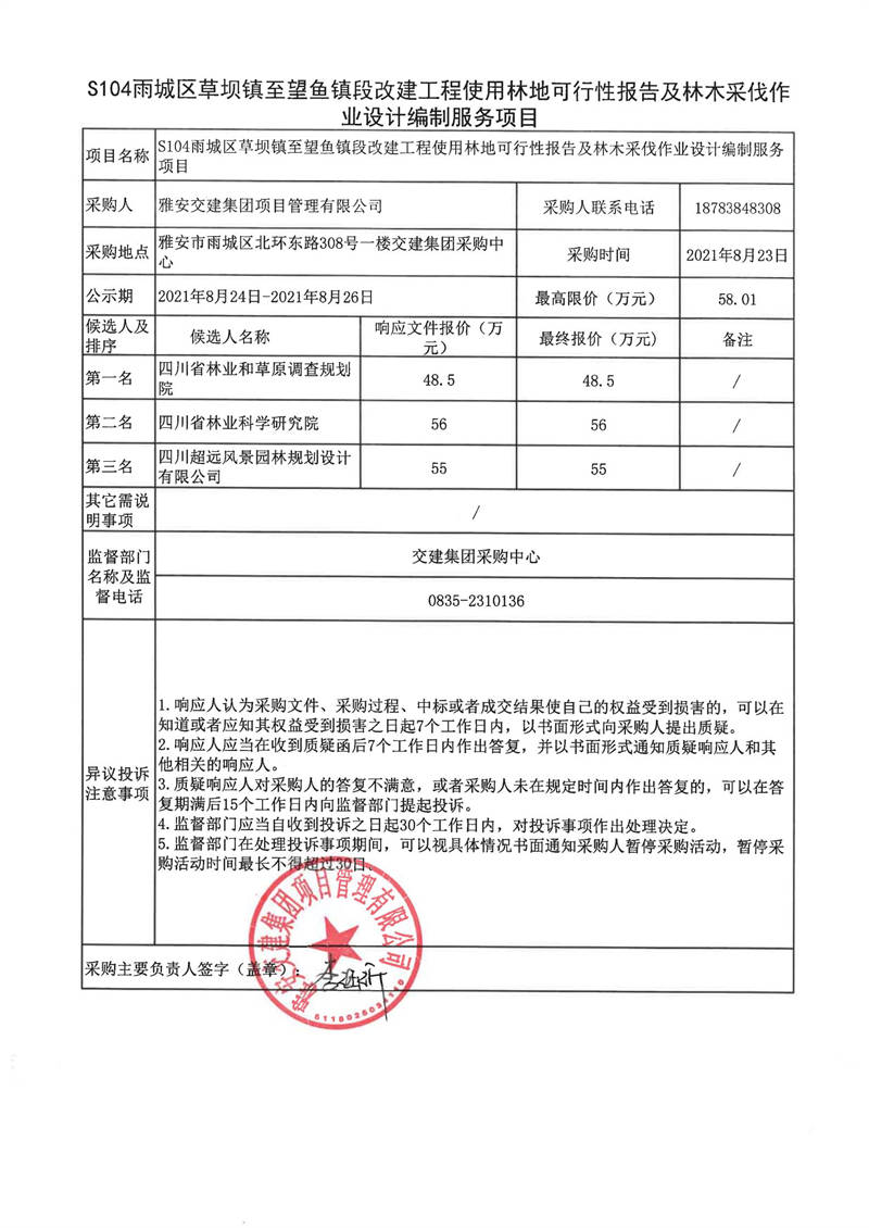 雅安交建集團(tuán)項(xiàng)目管理有限公司S104雨城區(qū)草壩鎮(zhèn)至望魚鎮(zhèn)段改建工程使用林地可行性報告及林木采伐作業(yè)設(shè)計(jì)編制服務(wù)項(xiàng)目評審結(jié)果公示
