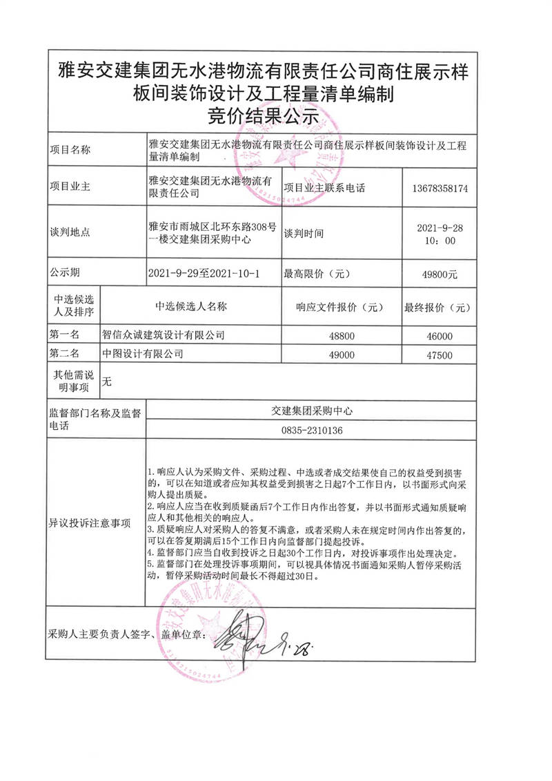 雅安交建集團(tuán)無水港物流有限責(zé)任公司商住展示樣板間裝飾設(shè)計(jì)及工程量清單編制競(jìng)價(jià)結(jié)果公示