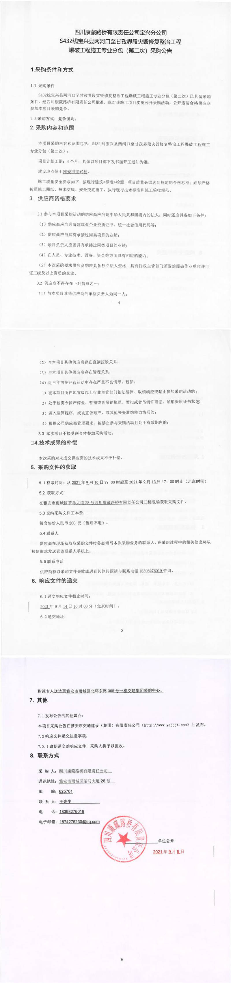 四川康藏路橋有限責(zé)任公司S432線寶興縣兩河口至甘孜界段災(zāi)毀修復(fù)整治工程爆破工程施工專業(yè)分包(第二次)采購公告