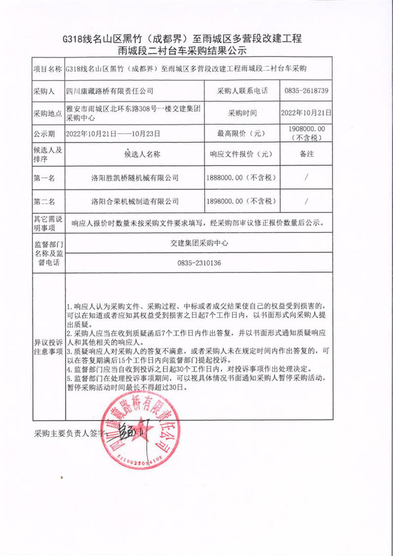 四川康藏路橋有限責(zé)任公司G318線名山區(qū)黑竹(成都界)至雨城區(qū)多營(yíng)段改建工程雨城段二襯臺(tái)車(chē)采購(gòu)結(jié)果公示