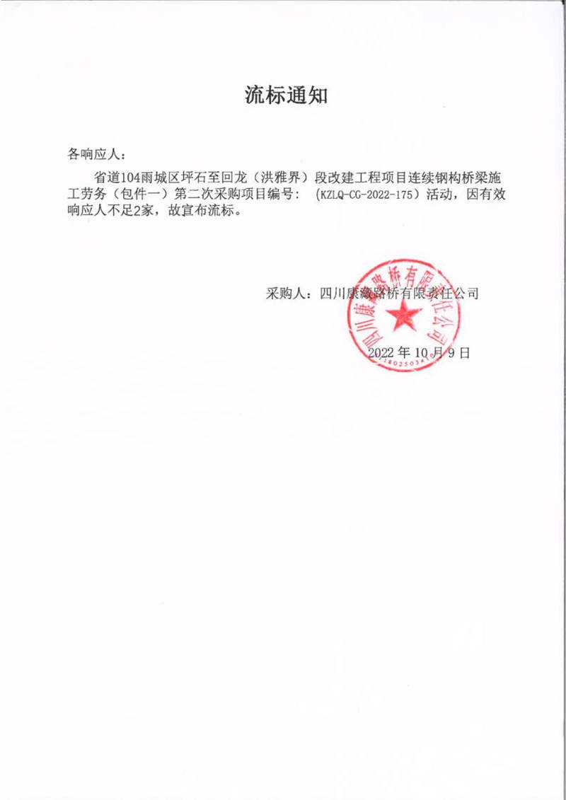 四川康藏路橋有限責(zé)任公司省道104雨城區(qū)坪石至回龍(洪雅界)段改建工程項(xiàng)目連續(xù)鋼構(gòu)橋梁施工勞務(wù)(包件一)第二次采購(gòu)項(xiàng)目流標(biāo)通知