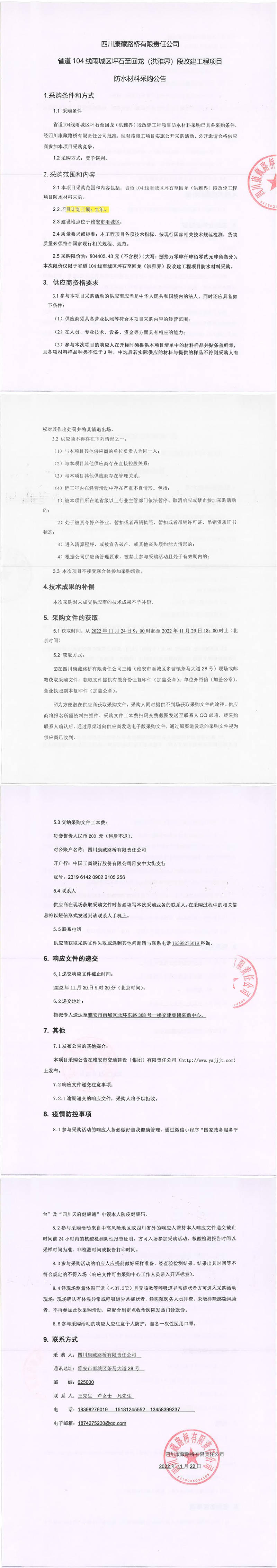 四川康藏路橋有限責(zé)任公司省道104雨城區(qū)坪石至回龍(洪雅界)段改建工程項(xiàng)目防水材料采購公告