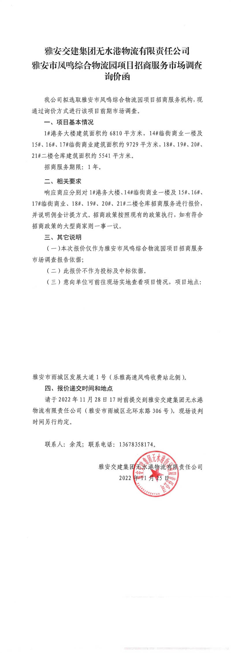 雅安交建集團(tuán)無水港物流有限責(zé)任公司雅安市鳳鳴綜合物流園項目招商服務(wù)市場調(diào)查詢價函
