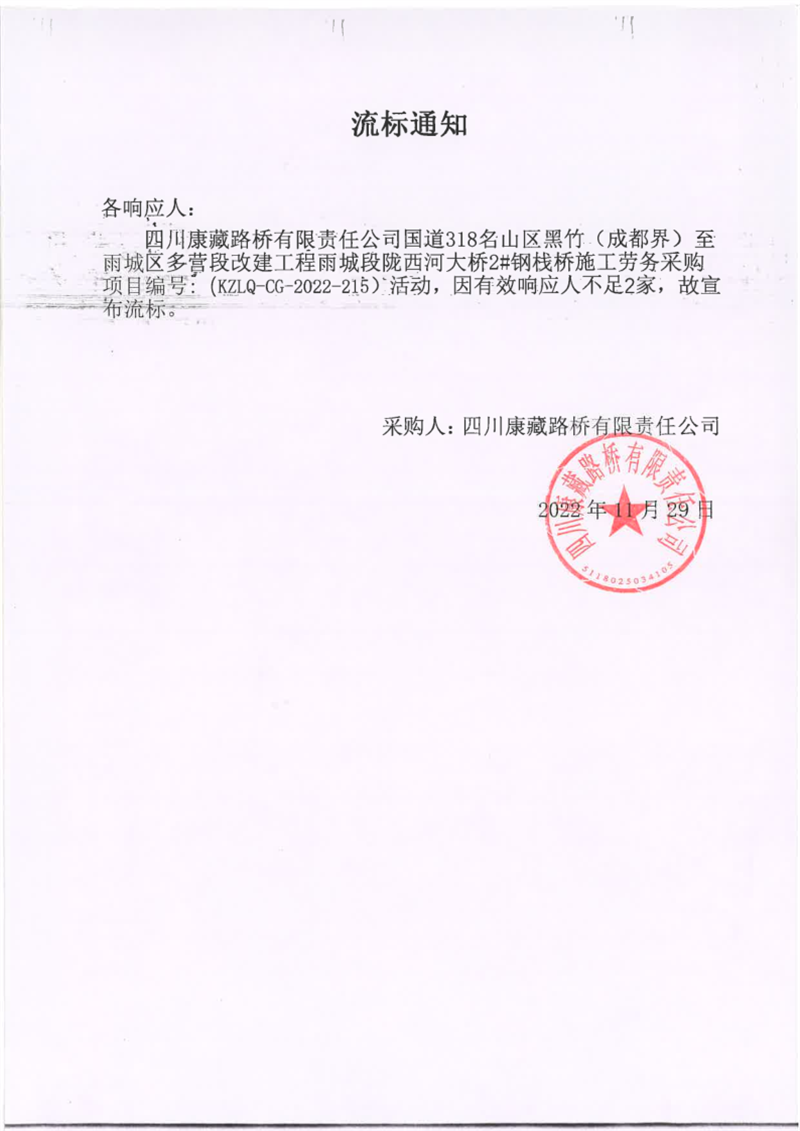 四川康藏路橋有限責(zé)任公司國道318名山區(qū)黑竹(成都界)至雨城區(qū)多營段改建工程雨城段隴西河大橋2#鋼棧橋施工勞務(wù)采購流標通知