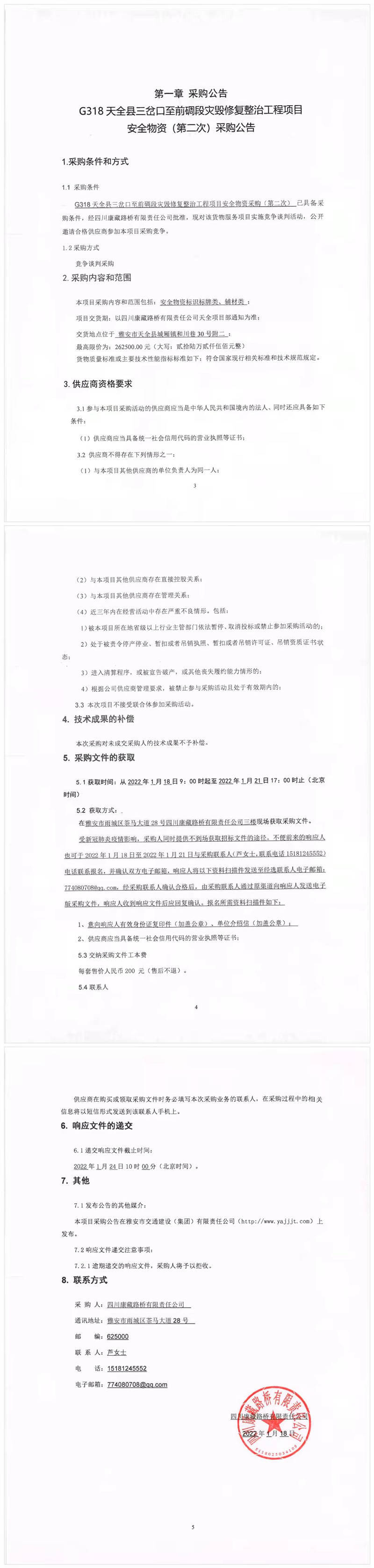 四川康藏路橋有限責任公司G318天全縣三岔口至前碉段災毀修復整治工程項目安全物資(第二次)采購公告