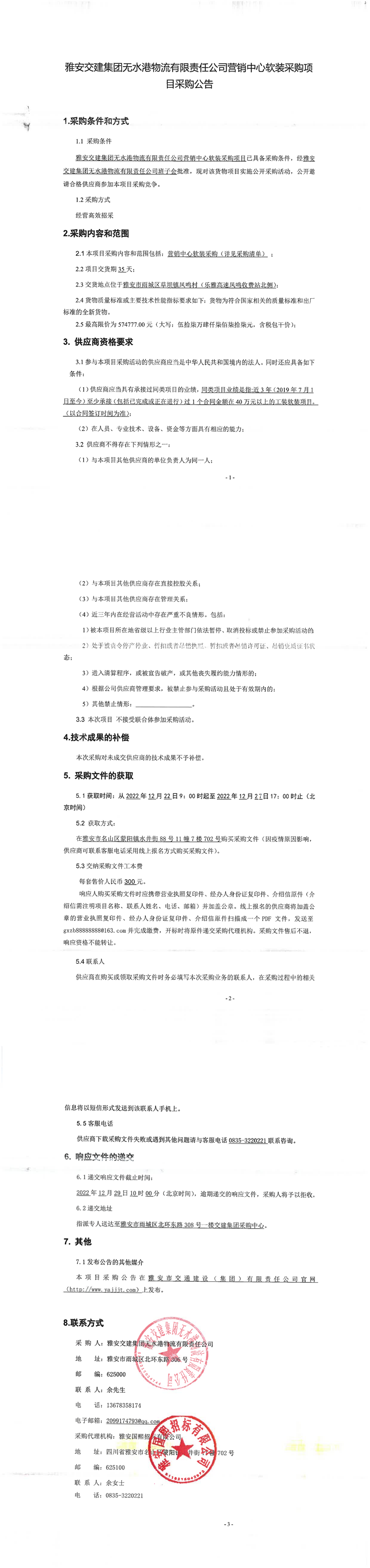 雅安交建集團(tuán)無水港物流有限責(zé)任公司營銷中心軟裝采購項目采購公告