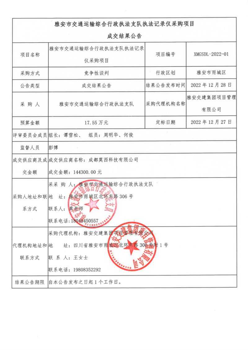 雅安交建集團項目管理有限公司雅安市交通運輸綜合行政執(zhí)法支隊執(zhí)法記錄儀采購項目成交結果公告