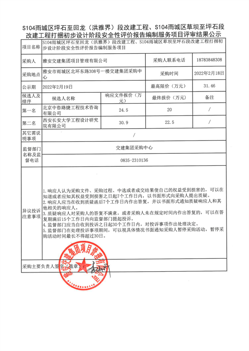 雅安交建集團(tuán)項目管理有限公司S104雨城區(qū)坪石至回龍(洪雅界)段改建工程、S104雨城區(qū)草壩至坪石段改建工程打捆初步設(shè)計階段安全性評價報告編制服務(wù)項目評審結(jié)果公示