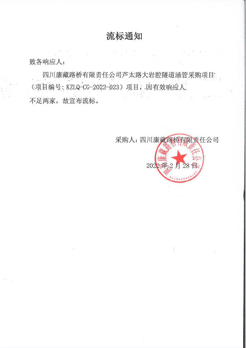 四川康藏路橋有限責(zé)任公司蘆太路大巖腔隧道涵管采購(gòu)項(xiàng)目流標(biāo)通知