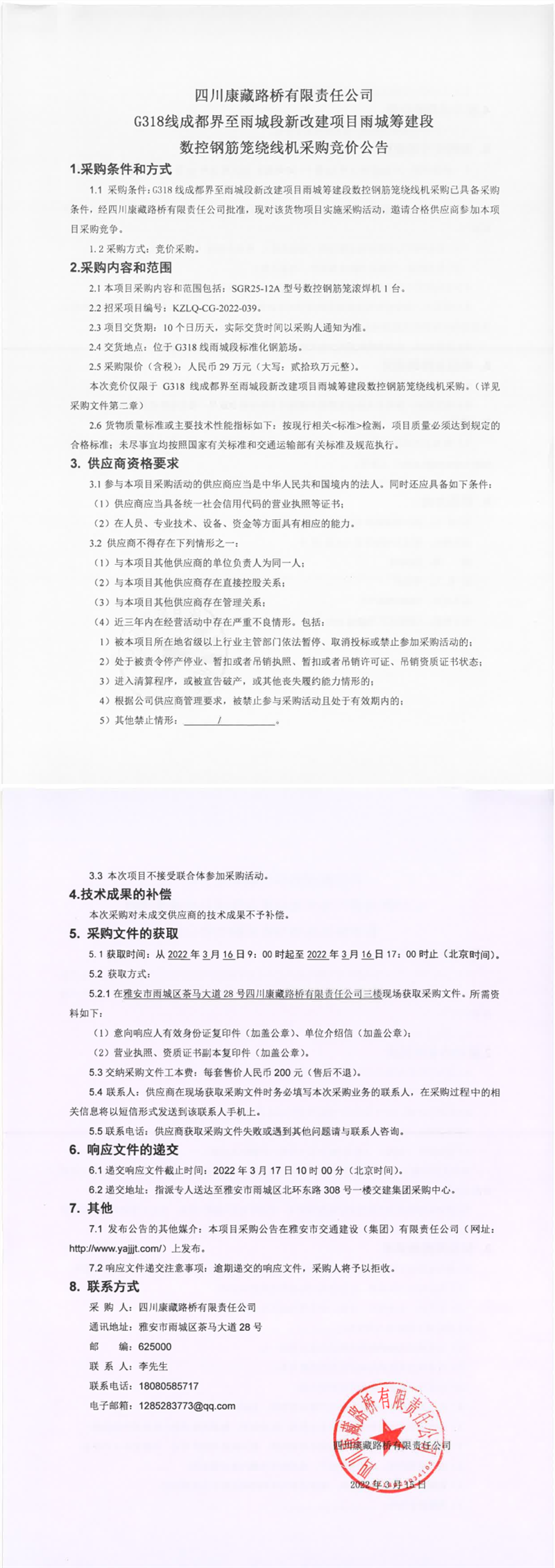 四川康藏路橋有限責(zé)任公司G318線成都界至雨城段新改建項(xiàng)目雨城籌建段數(shù)控鋼筋籠繞線機(jī)采購(gòu)競(jìng)價(jià)公告