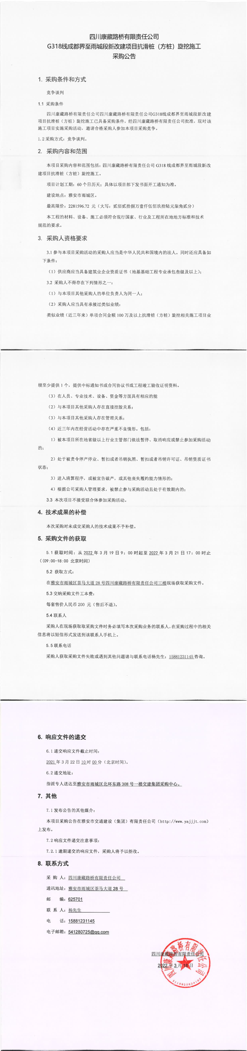四川康藏路橋有限責(zé)任公司G318線成都界至雨城段新改建項目抗滑樁(方樁)旋挖施工采購公告