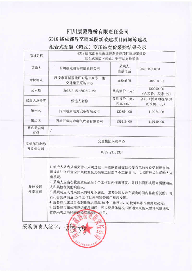 四川康藏路橋有限責任公司G318線成都界至雨城段新改建項目雨城籌建段組合式預(yù)裝(箱式)變壓站競價采購結(jié)果公示