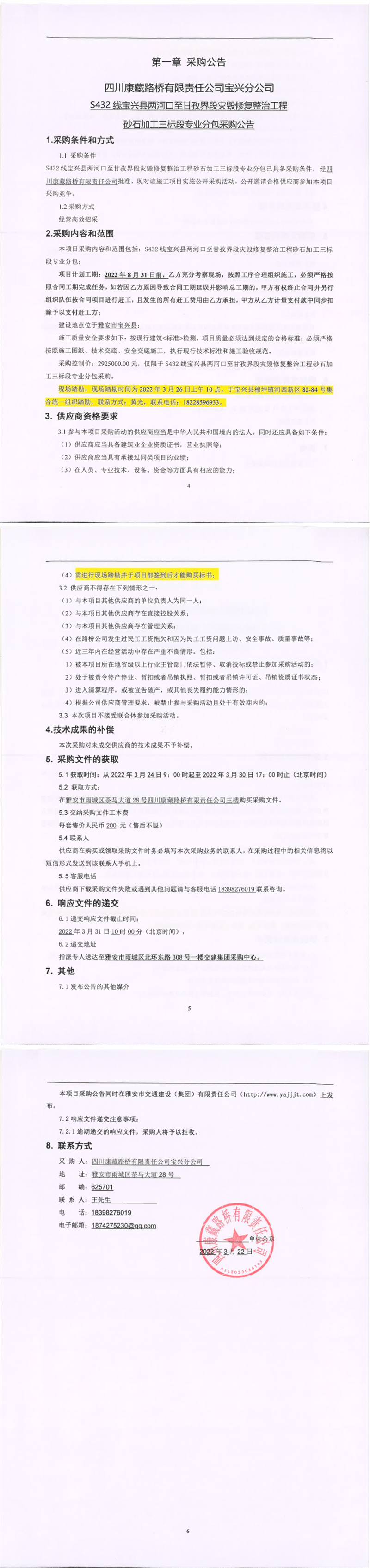 四川康藏路橋有限責(zé)任公司S432線(xiàn)寶興縣兩河口至甘孜界段災(zāi)毀修復(fù)整治工程砂石加工三標(biāo)段專(zhuān)業(yè)分包采購(gòu)公告