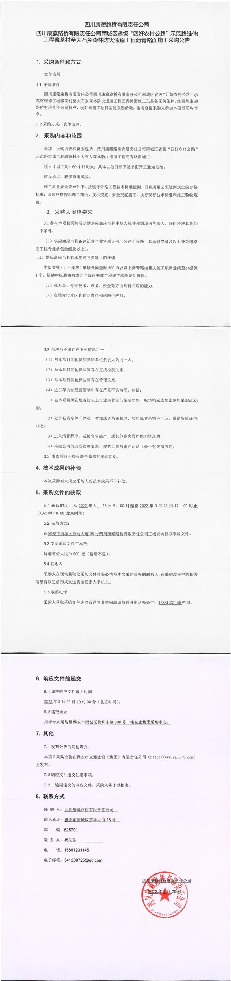 四川康藏路橋有限責任公司雨城區(qū)省級“四好農(nóng)村公路”示范路維修工程藏茶村至大石鄉(xiāng)森林防火通道工程瀝青路面施工采購公告