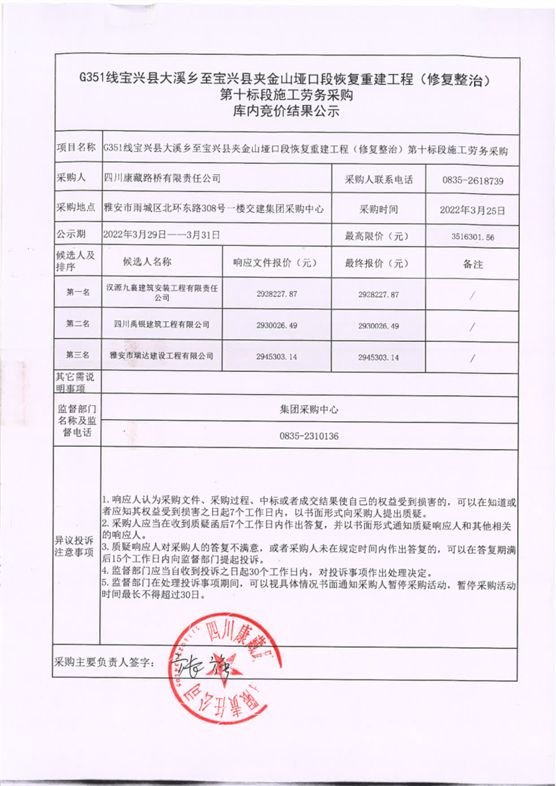 四川康藏路橋有限責(zé)任公司寶興分公司G351線寶興縣大溪鄉(xiāng)至寶興縣夾金山埡口段恢復(fù)重建工程(修復(fù)整治)第十標(biāo)段施工勞務(wù)采購(gòu)庫(kù)內(nèi)競(jìng)價(jià)結(jié)果公示
