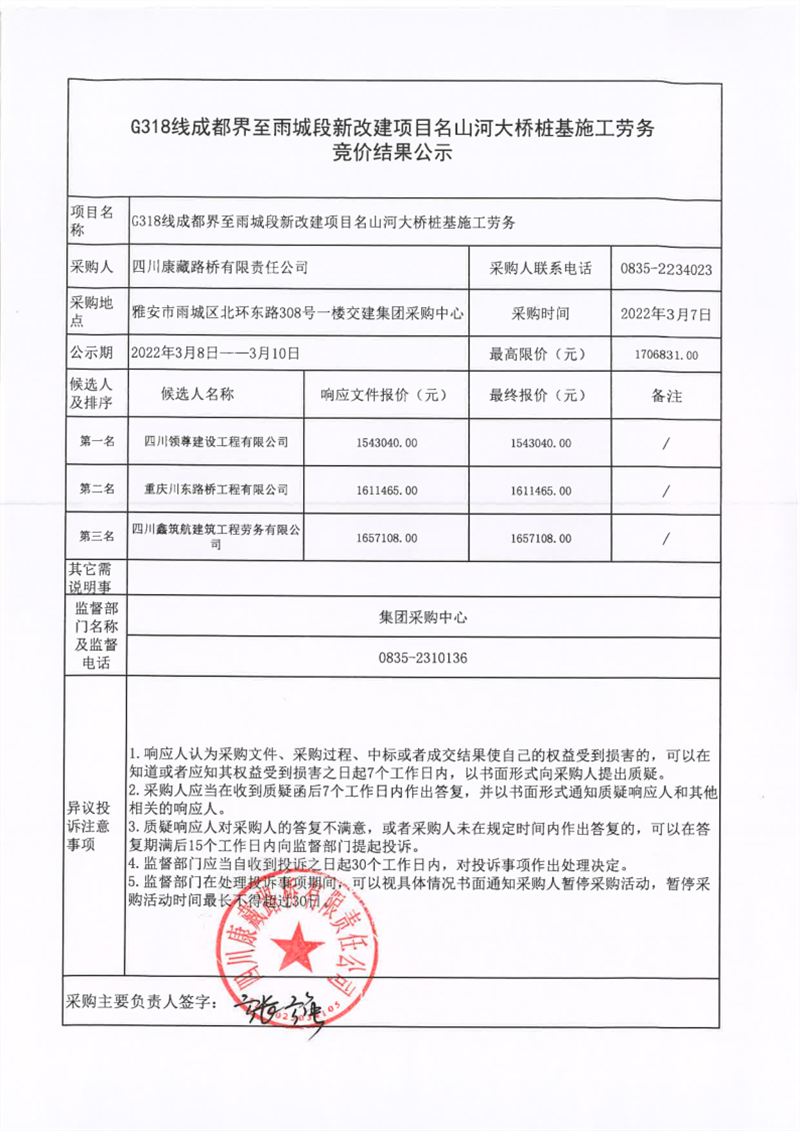 四川康藏路橋有限責任公司G318線成都界至雨城段新改建項目名山河大橋樁基施工勞務(wù)競價結(jié)果公示