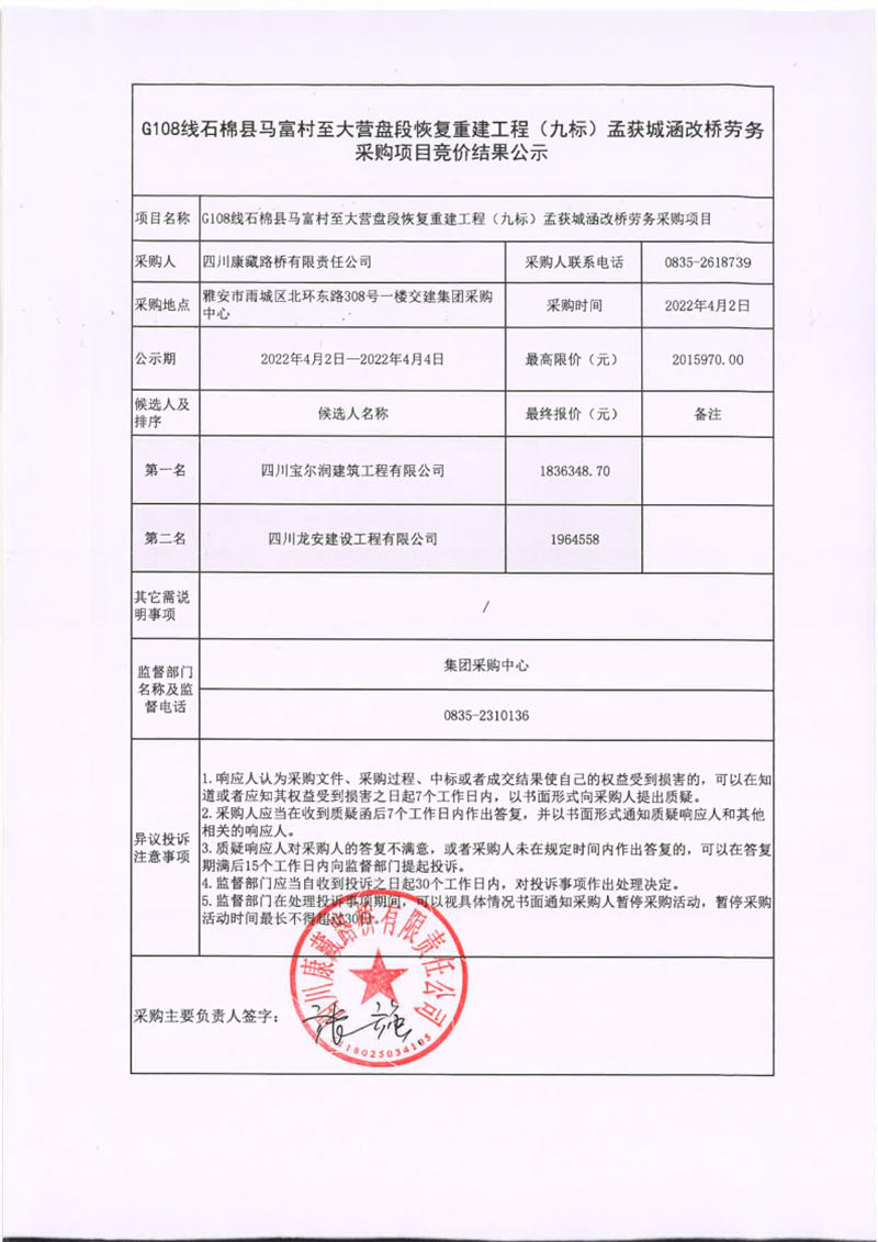 四川康藏路橋有限責(zé)任公司G108線(xiàn)石棉縣馬富村至大營(yíng)盤(pán)段恢復(fù)重建工程(九標(biāo))孟獲城涵改橋勞務(wù)采購(gòu)項(xiàng)目競(jìng)價(jià)結(jié)果公示