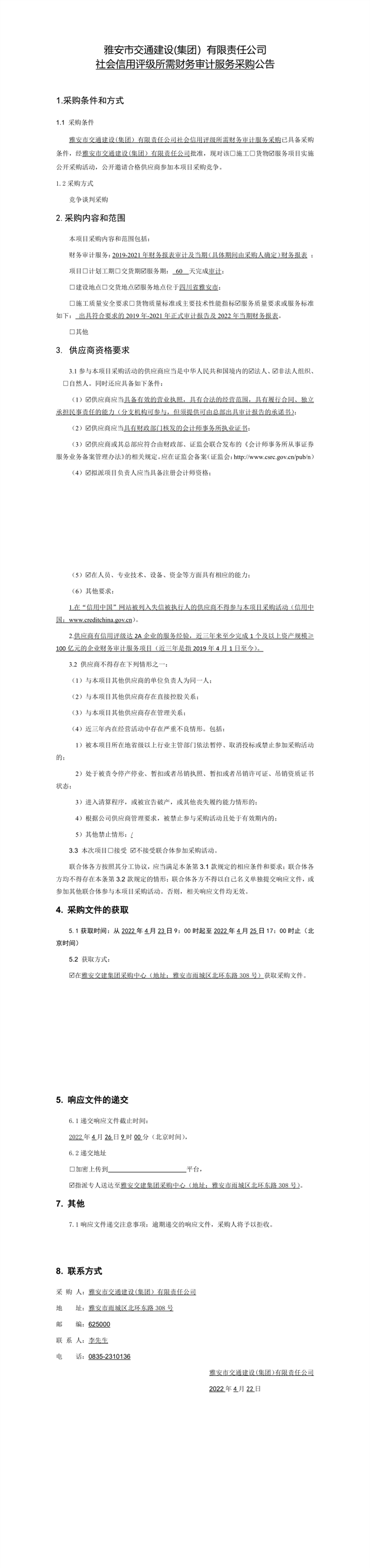 雅安市交通建設(shè)(集團(tuán))有限責(zé)任公司社會信用評級所需財務(wù)審計(jì)服務(wù)采購公告