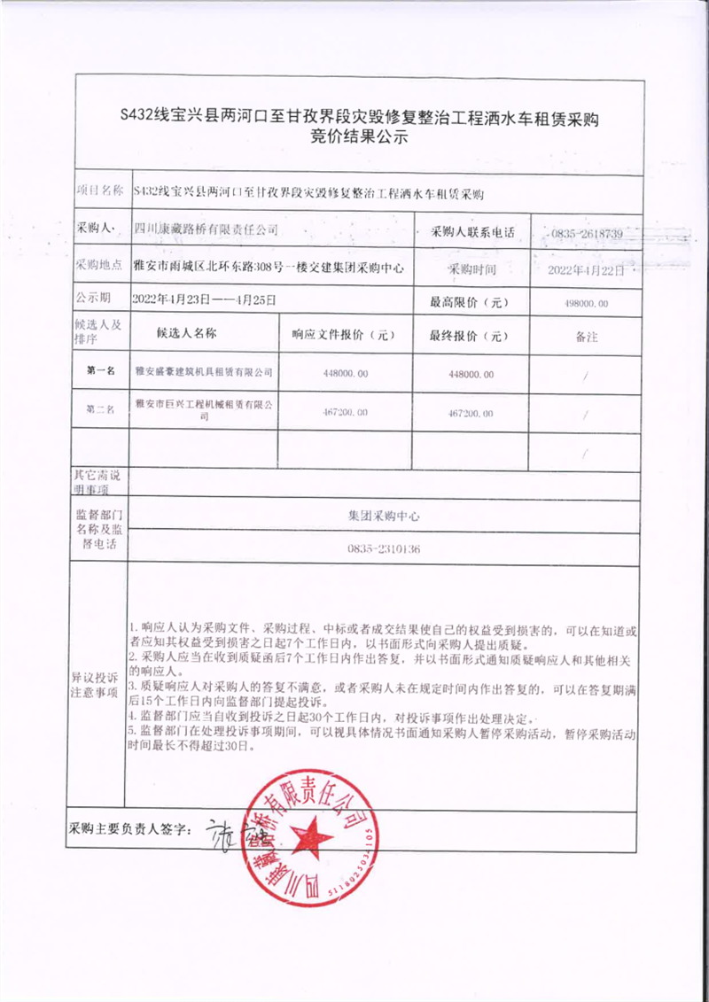 四川康藏路橋有限責(zé)任公司S432線寶興縣兩河口至甘孜界段災(zāi)毀修復(fù)整治工程灑水車租賃采購競價(jià)結(jié)果公示