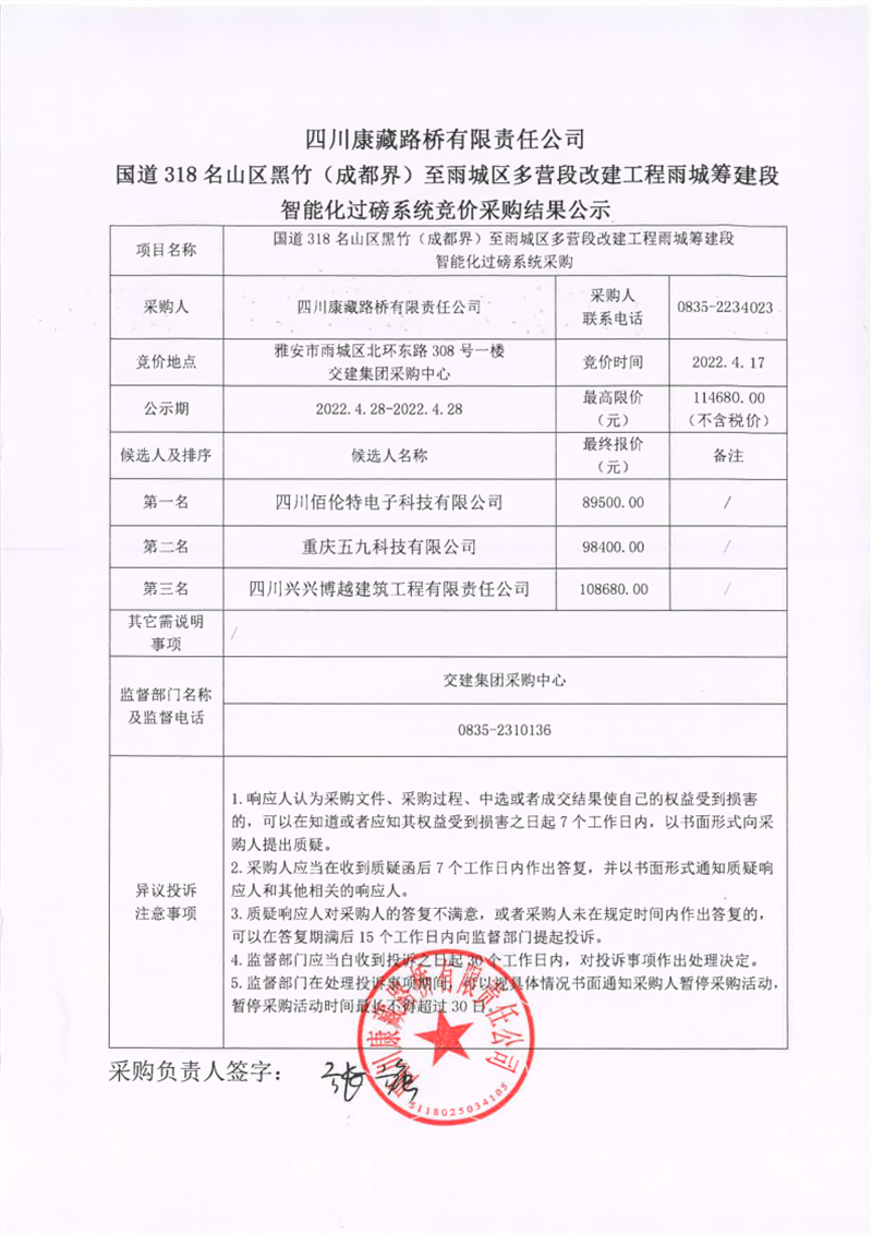 四川康藏路橋有限責(zé)任公司國(guó)道318名山區(qū)黑竹(成都界)至雨城區(qū)多營(yíng)段改建工程雨城籌建段智能化過(guò)磅系統(tǒng)競(jìng)價(jià)采購(gòu)結(jié)果公示
