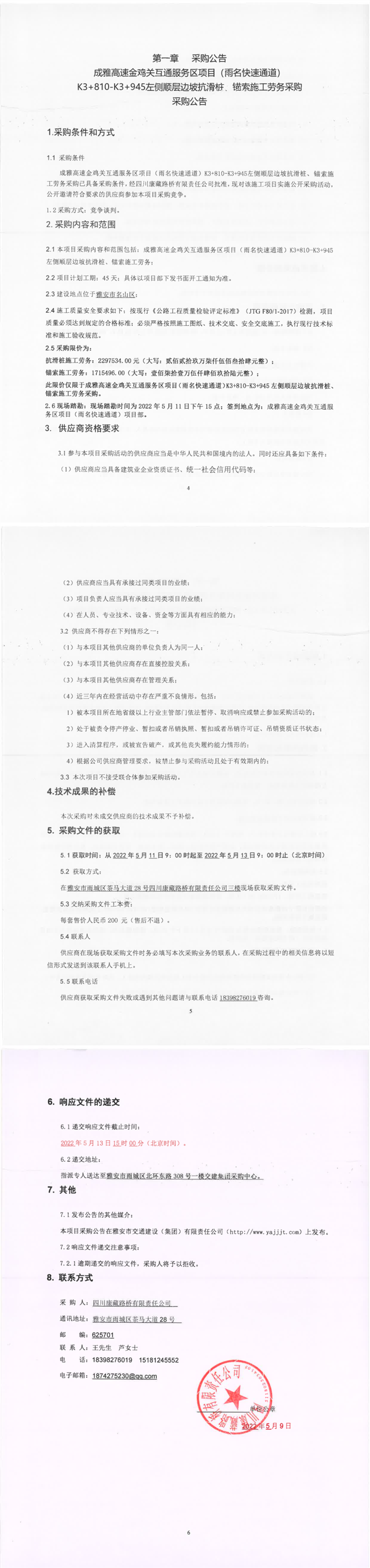 四川康藏路橋有限責(zé)任公司成雅高速金雞關(guān)互通服務(wù)區(qū)項(xiàng)目(雨名快速通道)K3+810-K3+945左側(cè)順層邊坡抗滑樁、錨索施工勞務(wù)采購采購公告