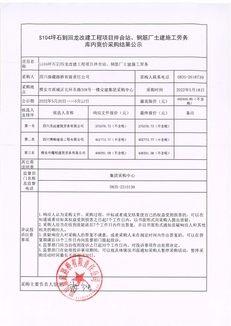 四川康藏路橋有限責(zé)任公司S104坪石到回龍改建工程項(xiàng)目拌合站、鋼筋廠土建施工勞務(wù)庫內(nèi)競(jìng)價(jià)采購(gòu)結(jié)果公示