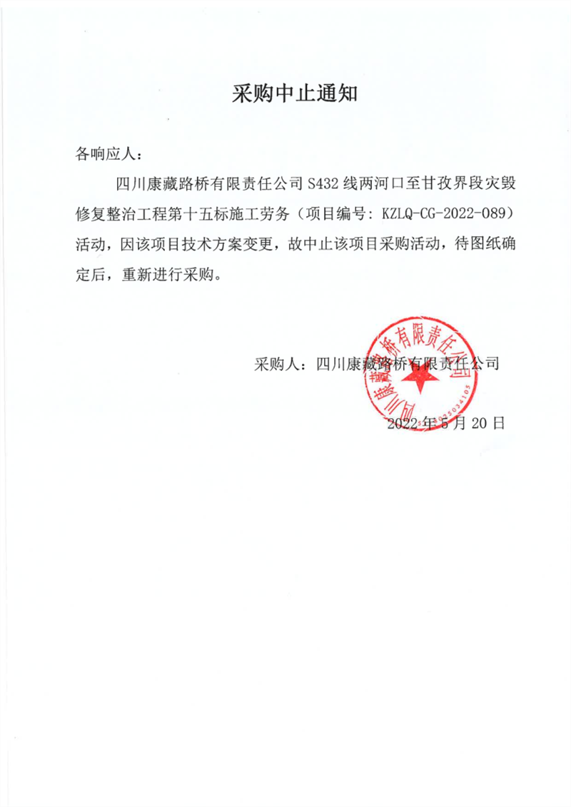 四川康藏路橋有限責(zé)任公司S432線寶興縣兩河口至甘孜界段災(zāi)毀修復(fù)整治工程第十五標(biāo)施工勞務(wù)采購(gòu)中止通知