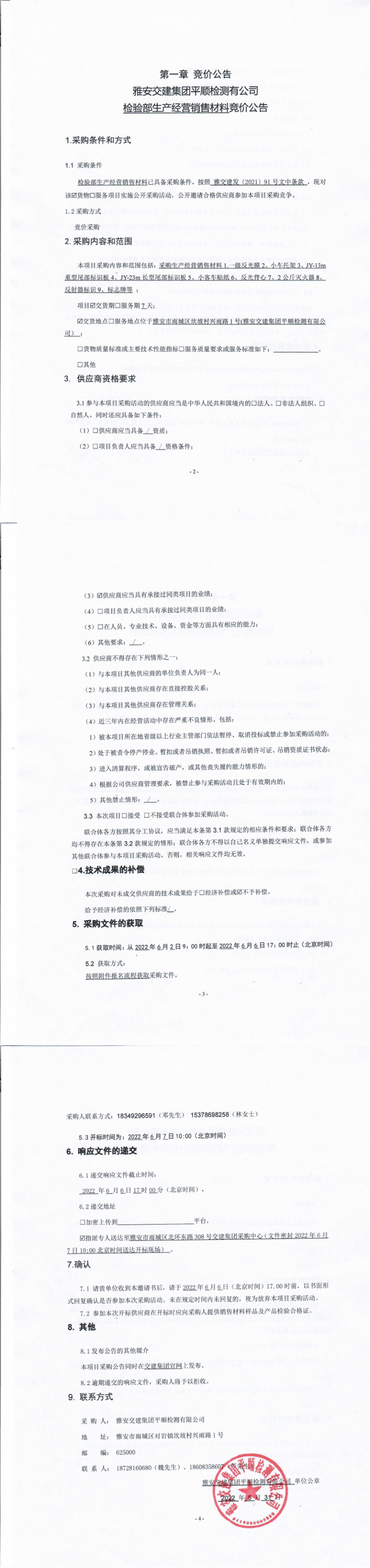 雅安交建集團平順檢測有限公司檢驗部生產(chǎn)經(jīng)營銷售材料競價公告