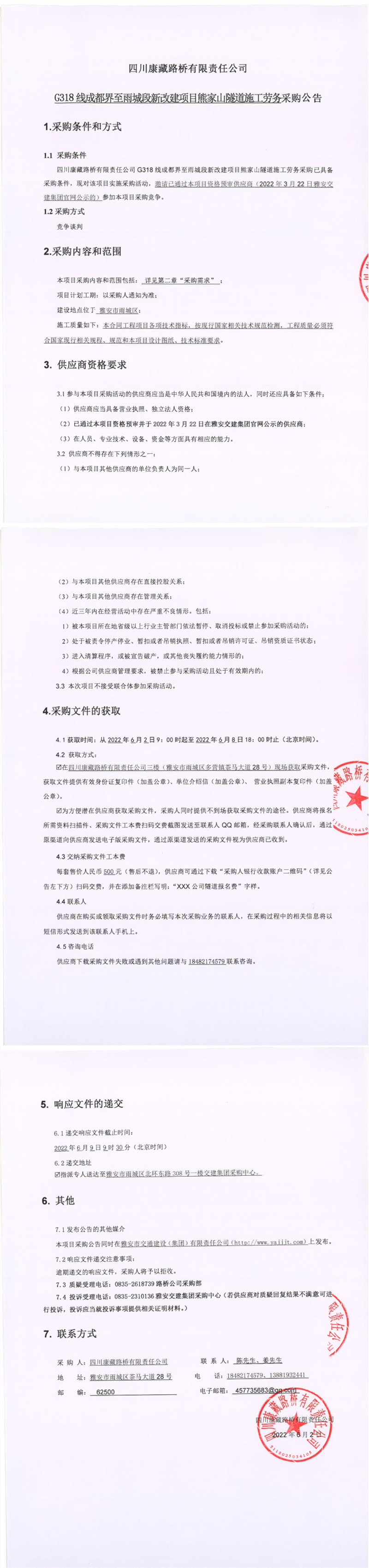 四川康藏路橋有限責任公司G318線成都界至雨城段新改建項目熊家山隧道施工勞務采購公告