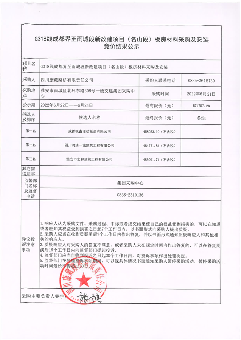 四川康藏路橋有限責(zé)任公司G318線成都界至雨城段新改建項(xiàng)目(名山段)板房材料采購(gòu)及安裝競(jìng)價(jià)結(jié)果公示